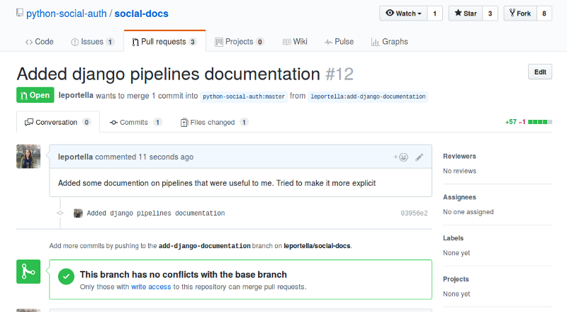 Então, encontrei as duas partes da documentação que eu gostaria de alterar. Eu gostaria de contribuir para a documentação geral do uso do módulo no Django e a parte mais específica de autenticação com o GitHub.